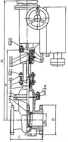 1 — корпус 2 — клин 3 — шпиндель 4 — прокладка 5 — крышка 6 — гайка 7 — шпилька 8 — набивка сальника 9 — втулка сальника 10 — фланец сальника 11 — гайка 12 — шпилька 13 — вкладыш 14 — вставка 15 — втулка кулачковая 16 — гайка 17 — шпилька 18 — винт 19 — масленка 20 — подшипник 21 — электропривод |