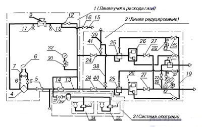 4 — фильтр 5, 12, 14, 16–18, 22–24, 27, 28, 30, 37, 40–43 — запорная арматура 6, 32, 33 — манометры 7 — блок вентильный 9 — измерительный комплекс 21 — клапан пружинный сбросной 25 — клапан предохранительный запорный 26, 36 — регуляторы давления |