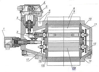 1 — датчик импульсов AIK 2 — редуктор 3 — магнитная муфта 4 — счетный механизм 5 — корпус головки счетного механизма 6 — ограничитель поворота 7 — крышка редуктора 8 — корпус 9, 14 — роторы 10 — крышка синхронизатора 11, 12 — колеса синхронизатора 13, 15 — основание 16 — крышка 17 —диск-формирователь |