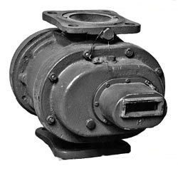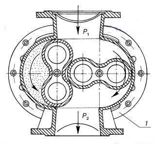 Объемное измерение в счетчике осуществляется вследствие вращения двух роторов восьмиобразной формы, которое происходит за счет разности давлений на входе и выходе. Измерительный объем счетчика определяется пространством, заключенным между стенкой корпуса и роторами. Газ поступает через входное отверстие в верхней части корпуса. При протекании газа через счетчик на выходе счетчика давление газа Р2 будет несколько ниже, чем давление на входе Р1. Благодаря разности давлений на входе и выходе роторы приводятся во вращательное движение и вращаются в направлении, указанном стрелками. При вращении роторов за каждый оборот дважды происходит наполнение камеры и дважды — выталкивание газа. Точность измерения обеспечивается точностью изготовления деталей, определяющих измерительный объем счетчика, минимальной величиной зазоров между роторами и корпусом, а также легкостью вращения роторов.