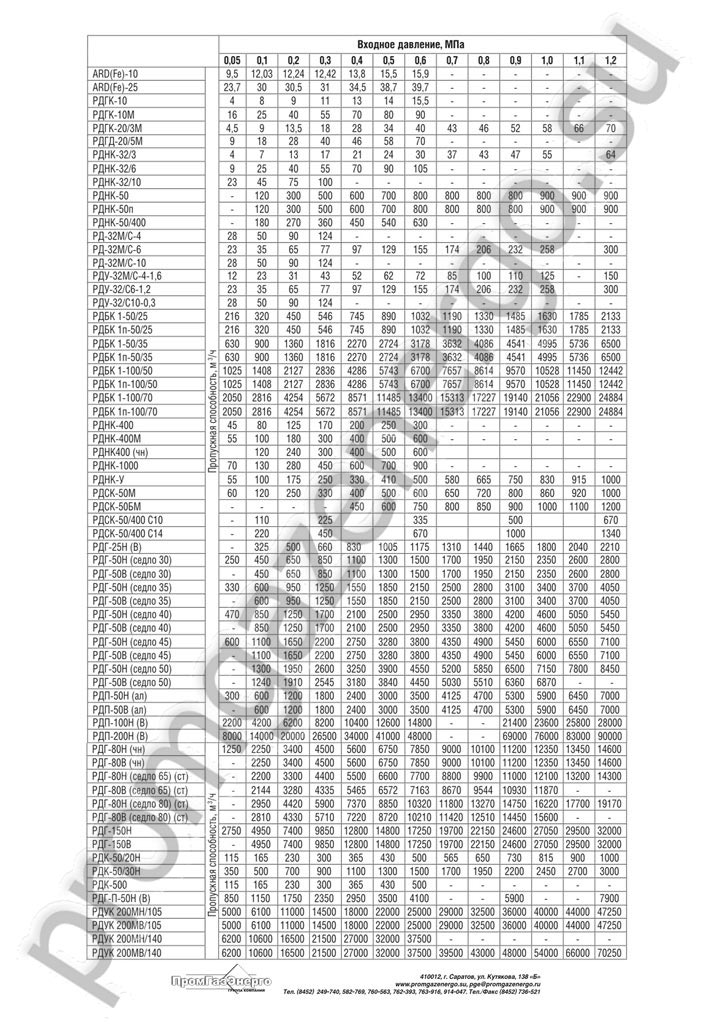В данной таблице собран максимально широкий спектр, производимых в РФ, регуляторов давления газа, приведена их пропускная способность, исходя из давления газа, подаваемого на регулятор. Данная таблица может являться руководством по более детальному выбору регулятора, с учитывая Ваши потребности.
