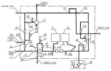 1 — основная линия 2 — обводная линия 4 — фильтр сетчатый 5 — счетчик газа 6 — термометр манометрический самопишущий 7 — манометр самопишущий 11 — клапан трехлинейный 3, 8, 9, 10, 14–16, 18–21, 23, 28, 29, 32 — запорная арматура 12, 22 — манометры 17 —предохранительно-сбросной клапан 30 — обогреватель 13, 31 — регуляторы давления |