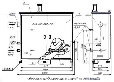 1 — шкаф 2 — оборудование технологическое 3, 4 — дверки 5 — обогреватель 6 — газопровод |