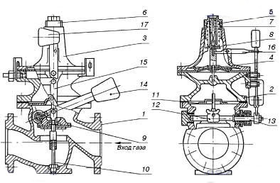 2 — переходной фланец 3 — крышка 4 — мембрана 5 — большая пружина 6 — пробка 7 — малая пружина 8 — шток 9 — клапан 10 — направляющая стойка 11 — тарелка 12 — вилка 13 — поворотный вал 14 — рычаг 15 — анкерный рычаг 16 — коромысло 17 — молоток Технические характеристики:ПКН(В)-50Рабочее давление: 1,2(12) МПа (кгс/см²)не болееДиапазон настройки на срабатывание ПКН: