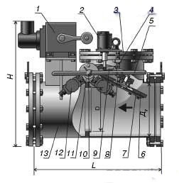 На заслонке имеется разгрузочное устройство. За счет резиновой прокладки 7 поворотная заслонка, прижимаясь к седлу, обеспечивает герметичность затвора клапана.