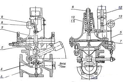 1 — корпус 2 — головка 3 — крышка головки 4 — клапан с резиновым уплотнителем 5 - анкерно-рычажная система 6 — механизм регулировки контролируемого давления 7 — мембрана со штоком 8 — фиксатор 9 — ось 10, 11 — пружина 12 — электропривод 13 — тяга |